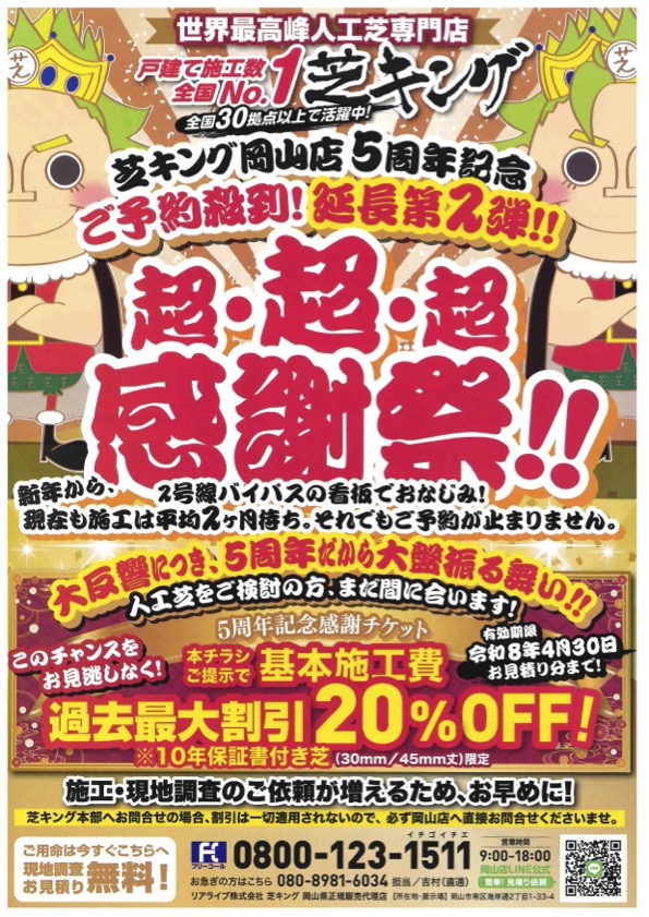 注意事項: 施工・現地調査のご依頼が増えるため、お早めに! 芝キング本部へお問合せの場合、割引は一切適用されないので、必ず岡山店へ直接お問合せくださいませ。